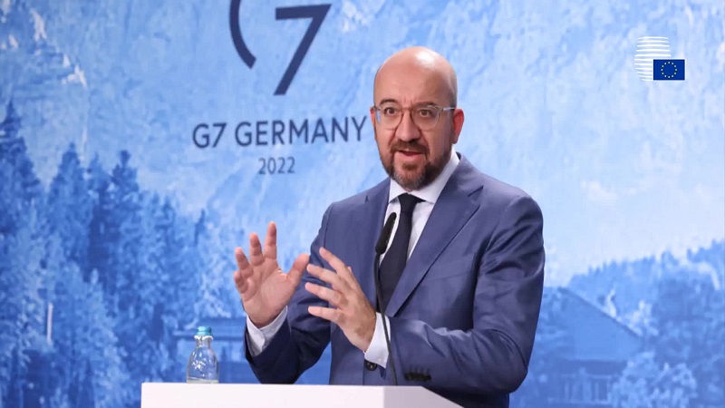 ევროპული საბჭოს პრეზიდენტმა შარლ მიშელმა, გერმანიაში "დიდი შვიდეულის" სამიტის დაწყებამდე გამართულ პრესკონფერენციაზე, უკრაინაში გაჩაღებულ ომსა და კანდიდატის სტატუსთან დაკავშირებულ საკითხებზე ისაუბრა.
