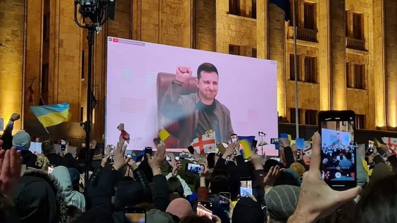 რუსთაველის გამზირზე, უკრაინის მხარდასაჭერად შეკრებილ მოქალაქეებს უკრაინის პრეზიდენტმა ვოლოდიმირ ზელენსკიმ მიმართა. მან თქვა, რომ თუ უკრაინა მტკიცედ ვერ იდგება, მტკიცედ იდგება ევროპაც.
