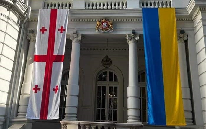 პრეზიდენტის სასახლეზე უკრაინის მხარდაჭერის ნიშნად უკრაინისა და საქართველოს დროშები გადმოიფინა.