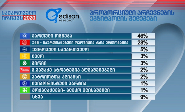 ქართული ოცნება 46%, ენმ-ძალა ერთობაშია 28%, ევროპელები 5% – Edison Research