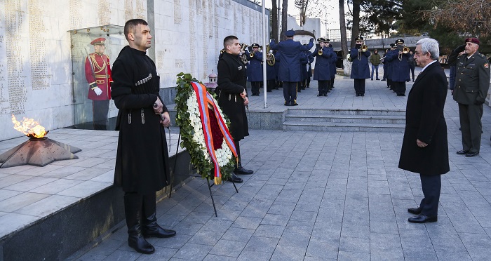 სომხეთის პრეზიდენტმა თბილისში გმირთა მემორიალი გვირგვინით შეამკო