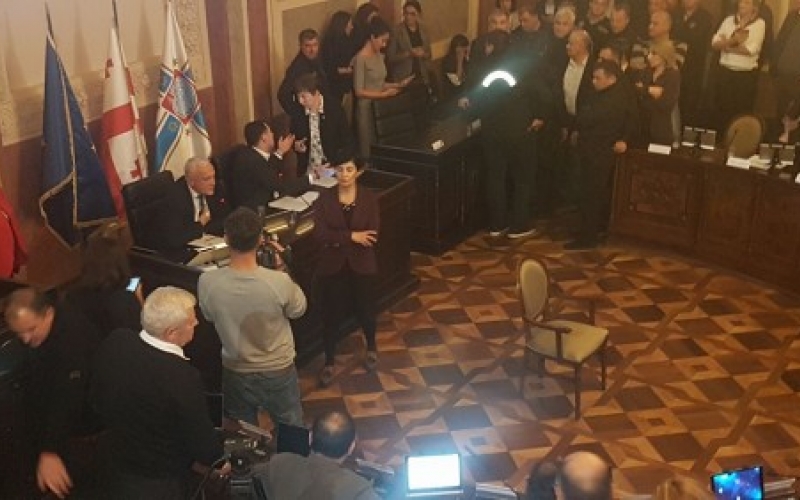 დედაქალაქის საკრებულოს სხდომა ხმაურის ფონზე მიმდინარეობს.