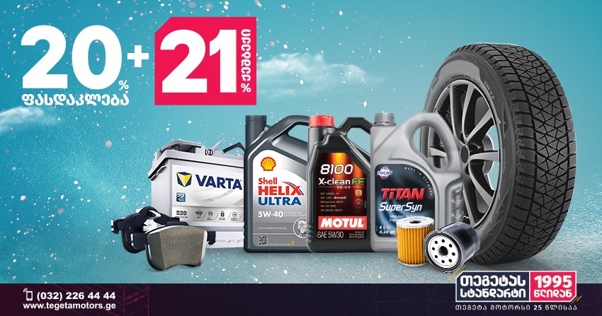 „თეგეტა მოტორსი“ მომხმარებლებს წინასაახალწლო აქციას „20+21“ სთავაზობს, რაც გულისხმობს 20% ფასდაკლებას და დამატებით 21% ქეშბექს. აქცია ყოველდღე თითო კატეგორიის პროდუქტზე მოქმე... -