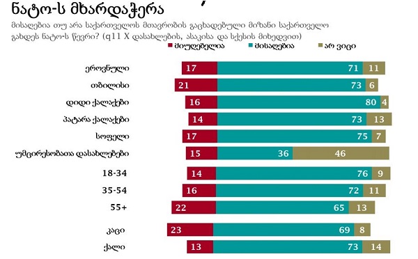 ქვეყნის ნატო-ში ინტეგრაციას მოსახლეობის 71 პროცენტი უჭერს მხარს -„ ეროვნულ დემოკრატიულმა ინსტიტუტმა“ საზოგადოებრივი კვლევის შედეგები გამოაქვეყნა. კითხვაზე – მისაღებია თუ არა საქართვ... -