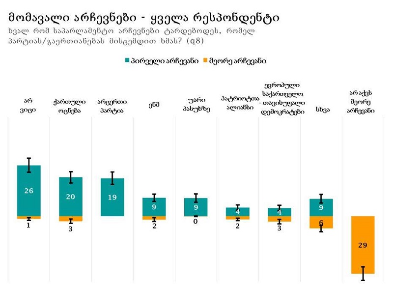 ეროვნულ-დემოკრატიული ინსტიტუტისა (NDI) და „კავკასიის კვლევითი რესურსების ცენტრი (CRRC) საქართველო“-ს მიერ ჩატარებულ კვლევაში კითხვაზე, ხვალ რომ საპარლამენტო არჩევნები ტარდებოდეს, რომელ პარ... -