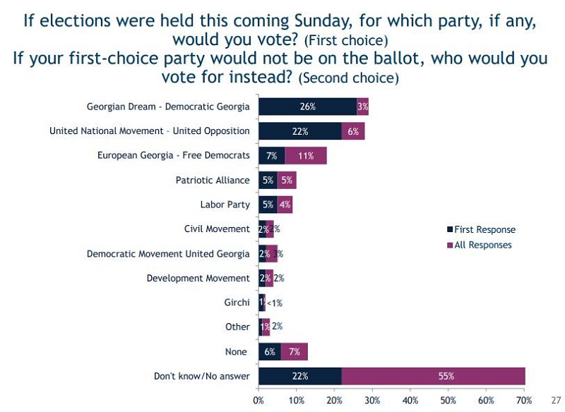 კვირას რომ არჩევნები იყოს 26% „ქართულ ოცნებას“ მისცემდა ხმას, 22% - „ნაციონალურ მოძრაობას“ - IRI
