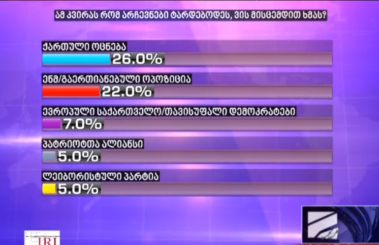 "ქართული ოცნების" მხარდამჭერები -25%, ოპოზიციური ხმები - 39% - „რუსთავი 2“-მა IRI-ის კვლევა მოიპოვა