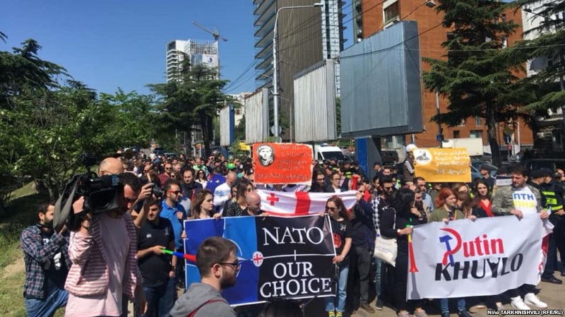 თბილისის ვაკის პარკთან მოძრაობა “რუსეთი ოკუპანტიას“ აქტივისტები საქართველოში „უკვდავი პოლკის“ მსვლელობას აპროტესტებენ.