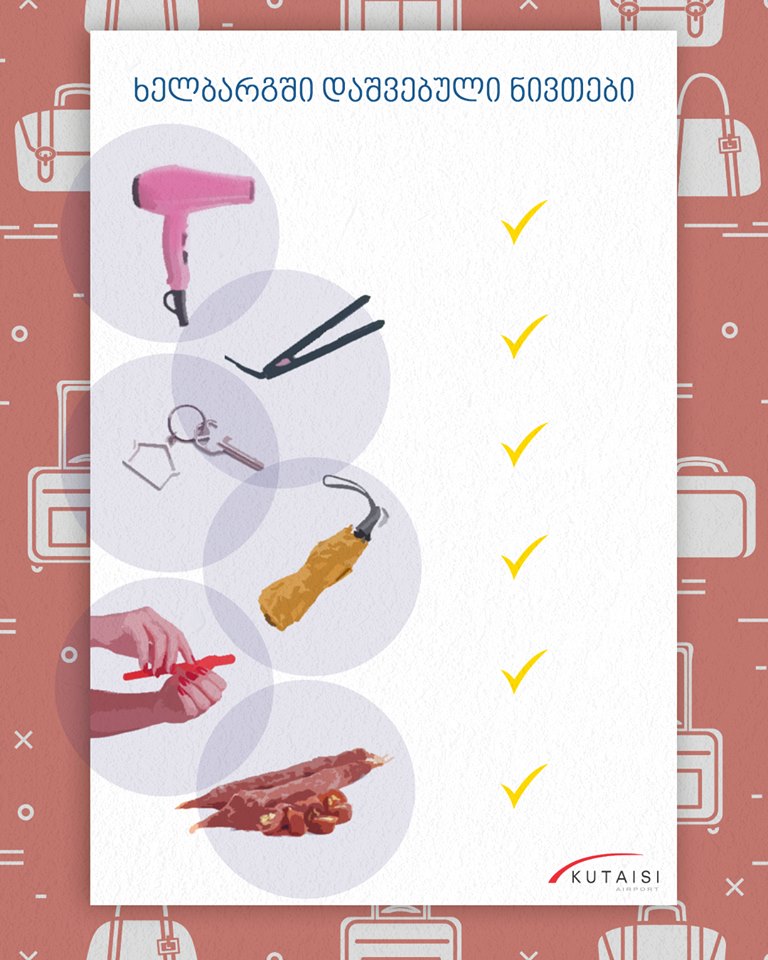 რისი ატანა შეგიძლიათ თვითმფრინავში ხელბარგით? ხშირად დასმული კითხვებიხელბარგში დაშვებულია და შეგიძლიათ ჩადოთ: სახლისა და ავტომობილის გასაღები თმის საშრობი თმის უთო ფრჩხილის ქლიბი ქოლგა და რაც ...