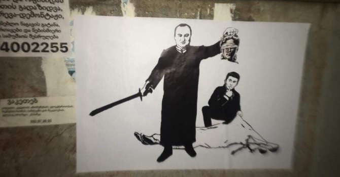 თემიდას მოკვეთილი თავი ხელში ლევან მურუსიძეს უჭირავს - პლაკატები იუსტიციის საბჭოსთან