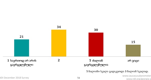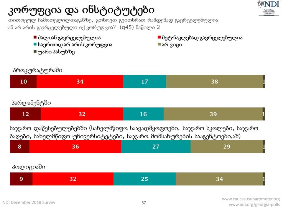 ეროვნულ-დემოკრატიული ინსტიტუტის( NDI) კვლევის შედეგების მიხედვით, გამოკითხულთა 30% მიიჩნევს, რომ საქართველოში კორუფცია ძალიან გავრცელებულია. 34%-ის აზრით, საშუალოდ, ხოლო 21% ამბობს, რომ ქვეყანაში კორუ... -