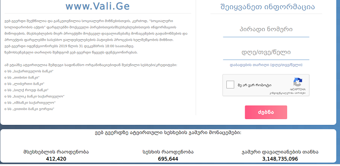 სესხების განულებაზე მოქალაქეთა მონაცემები ვებგვერდ vali.ge -ზე აიტვირთება
