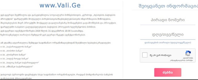 ვებგევრდი vali.ge დღეს, 18:00 საათიდან ამოქმედდება. დღეს და ხვალ ვებგვერდზე სამი ბანკის მომხმარებელთა მონაცემები აიტვირთება: „საქართველოს ბანკის“, „თიბისი ბანკისა“&nb...