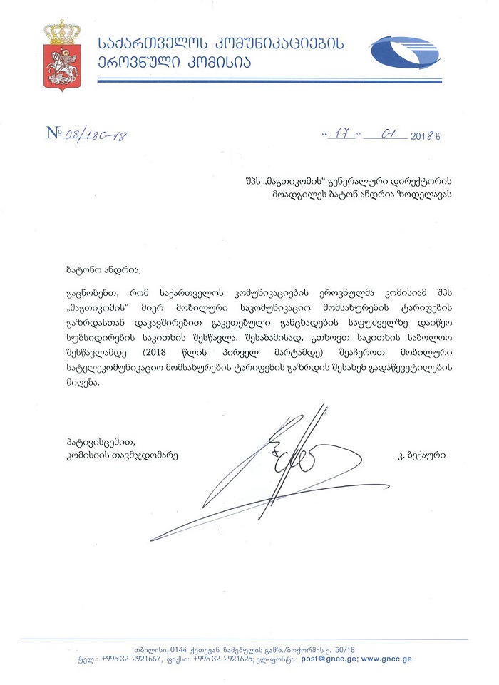 "მაგთიკომმა" გაითვალისწინა საქართველოს კომუნიკაციების ეროვნული კომისიის წერილობითი თხოვნა და დროებით შეაჩერა ტარიფების ცვლილების ამოქმედება. აღსანიშნავია, რომ "მაგთიკომი" 5 იანვარს გავრ... -