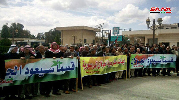 სირიაში, ქალაქ დერაას მოსახლეობამ ვაშინგტონის მიერ გოლანის მაღლობებზე ისრაელის სუვერენიტეტის აღიარება გაპროტესტა. ასობით სირიელი დემონსტრაციაზე ტრანპსარანტებითა და ლოზუნგებით გამოვიდა. „ვფ...