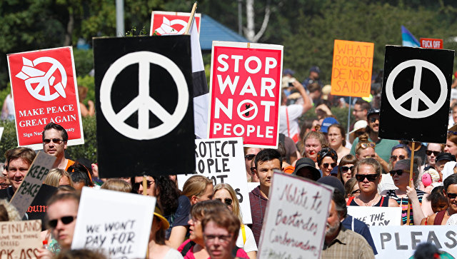 ჰესლინკში ტრამპისა და პუტინის შეხვედრის მოწინააღმდეგეთა აქციაზე საქართველოსა და უკრაინის დროშები გამოიტანეს