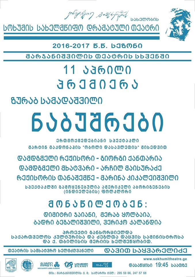 კ. გამსახურდიას სახელობის სახელმწიფო დრამატული თეატრი პრემიერისთვის ემზადება. „ნაბუშრები“ - ასე ჰქვია სპექტაკლს, რომელიც მარჯანიშვილის თეატრის სხვენში 11 აპრილს გაიმართება.